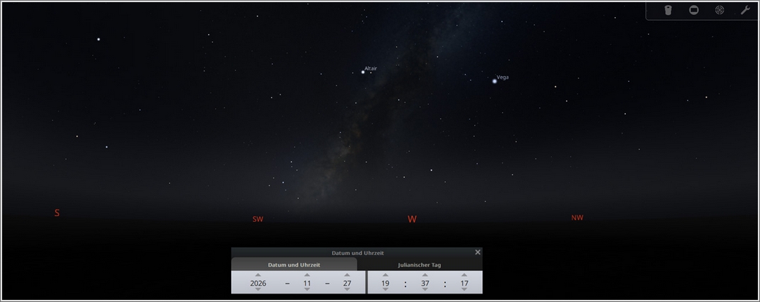 Westhimmel mit Zodiakallicht am dritten Workshopabend nach Ende der Abenddämmerung, Quelle: Stellarium