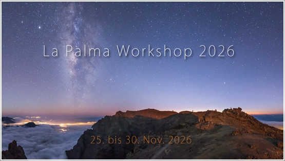 Oktober 2019 - Ab sofort findet sich auf sternstunden.net ein regelmäßiges Programm an Astrofoto Workshops. Die Seminare bestehen aus Theorie- und Praxisteilen und finden an Orten mit dunklem Sternenhimmel statt: an der Nordsee, auf den Kanarischen Inseln und in Skandinavien.