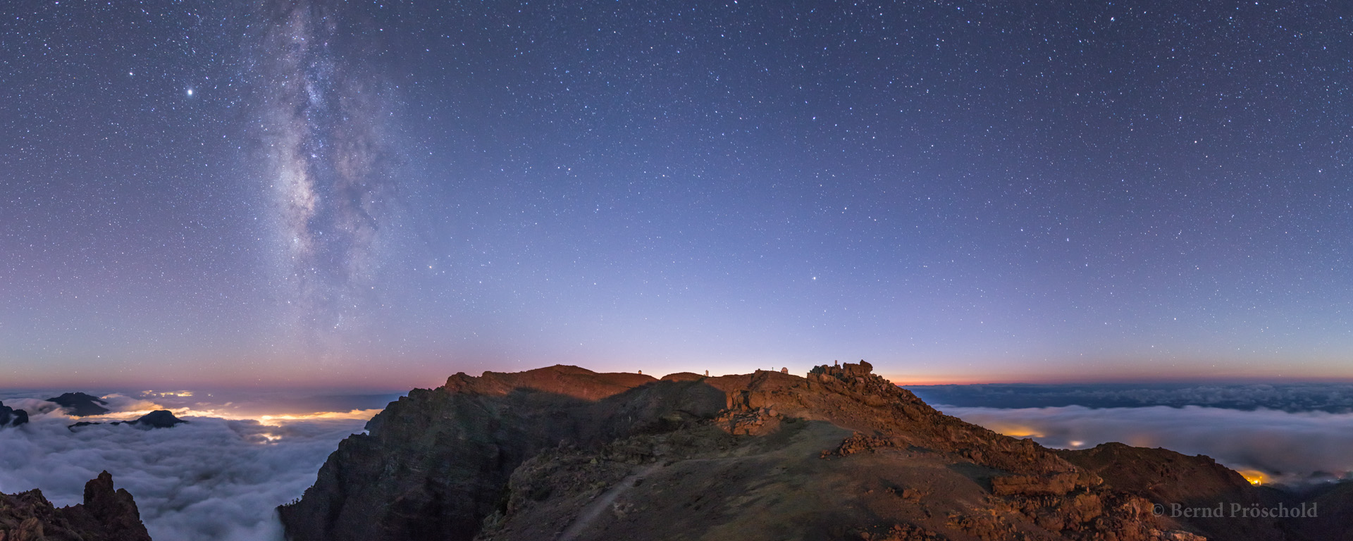 Nach Dämmerungsende spannt die Milchstraße einen weiten Bogen über den nördlichen Horizont. Während im Osten bereits die Wintersternbilder Stier und Orion aufgehen, ist im Westen noch die Sommermilchstraße zu sehen, wo sie vom Lichtkegel des Zodiakallichtes flankiert wird. Fotografisch besonders spannend wird es bei Mondaufgang, wenn sich der spitze Schatten des Roque de Los Muchachos über dem Atlantischen Ozean abzeichnet.