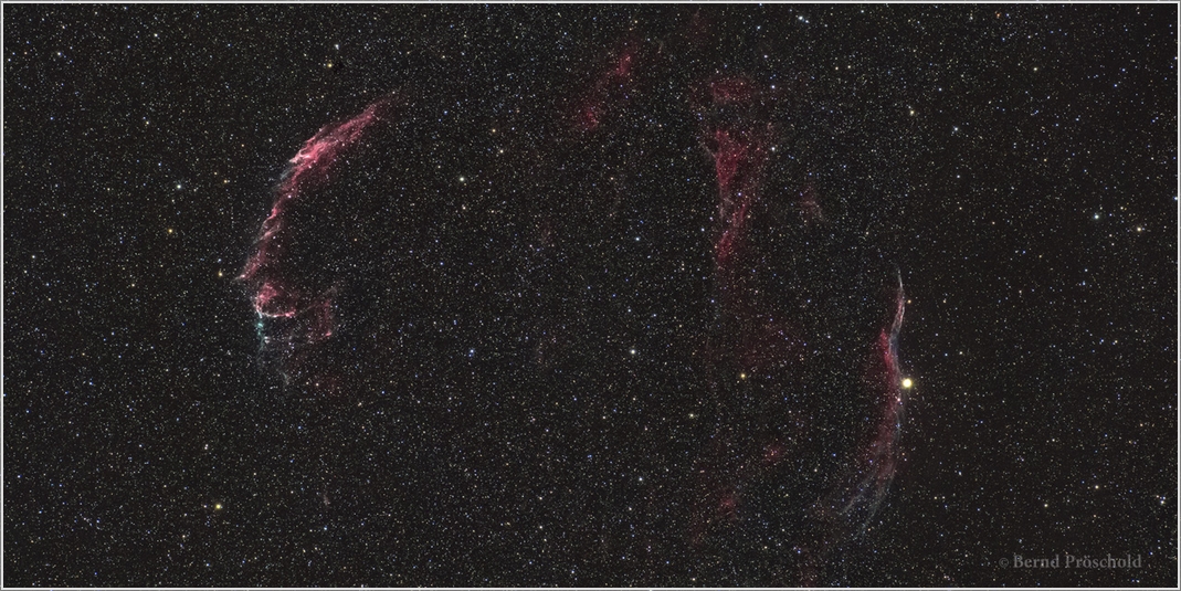 Cirrusnebel im Sternbild Schwan, Stack aus 4 Bildern, je eine Minute belichtet bei ISO 6400 mit 432mm f/6 und einer astromodifizierten Canon 6D