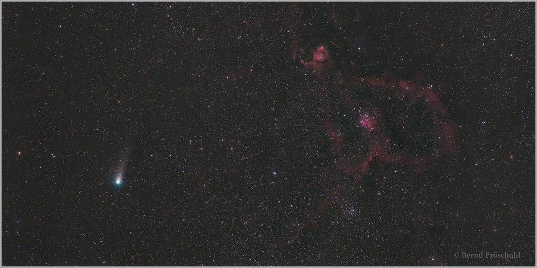 Herznebel mit dem Kometen Giacobini Zimmer, Mosaik aus 9 Einzelbelichtungen à 2 Minuten bei ISO 6400 mit 600mm f/7 und astromodifizierter Canon 6D; Bildausschnitt entspricht etwa 250mm Brennweite im Vollformat