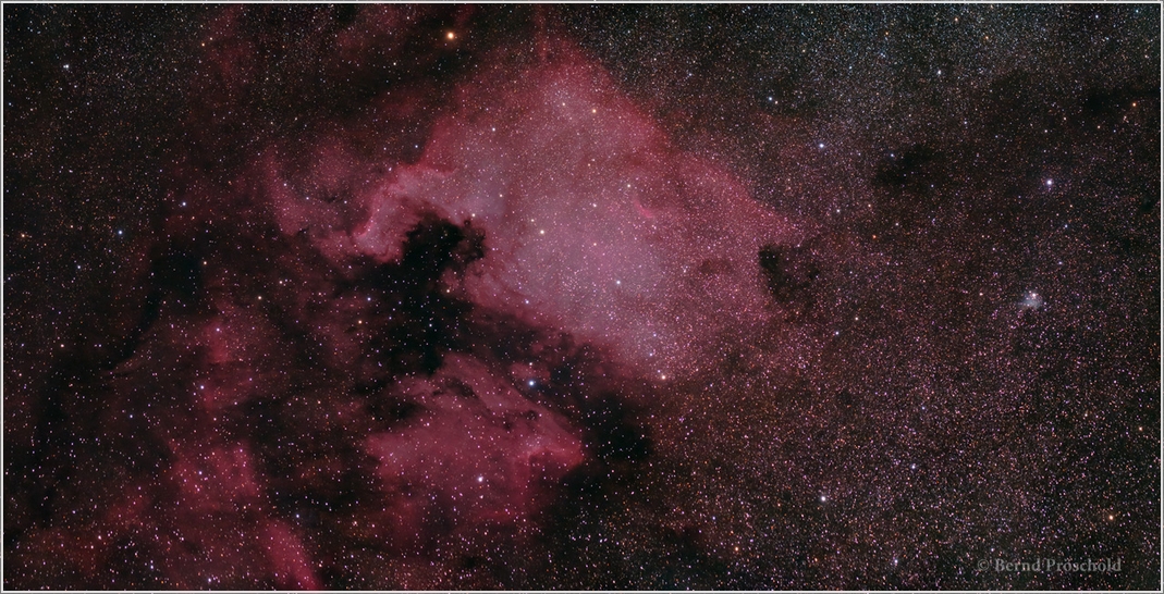 Der Nordamerikda-Nebel im Sternbild Schwan, Mosaik aus 5 Bildern, je 4 Minuten belichtet bei ISO 1600 mit 600mm f/7 und astromodifizierter Canon 6D, Bildausschnitt entspricht etwa 200mm Brennweite im Vollformat